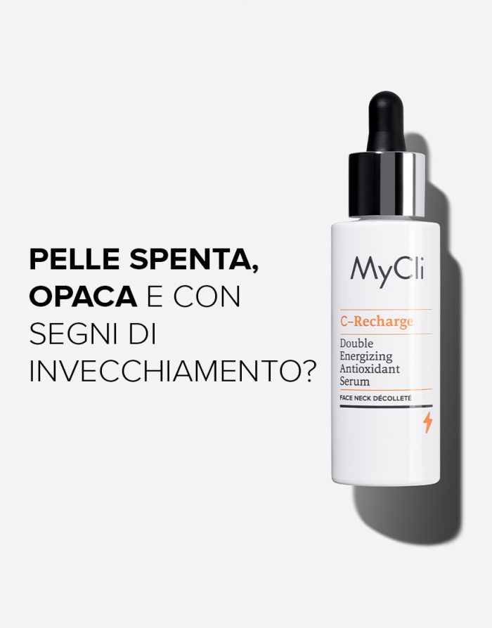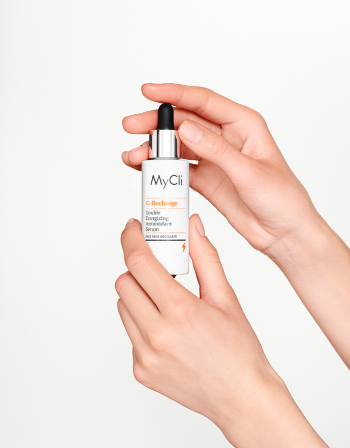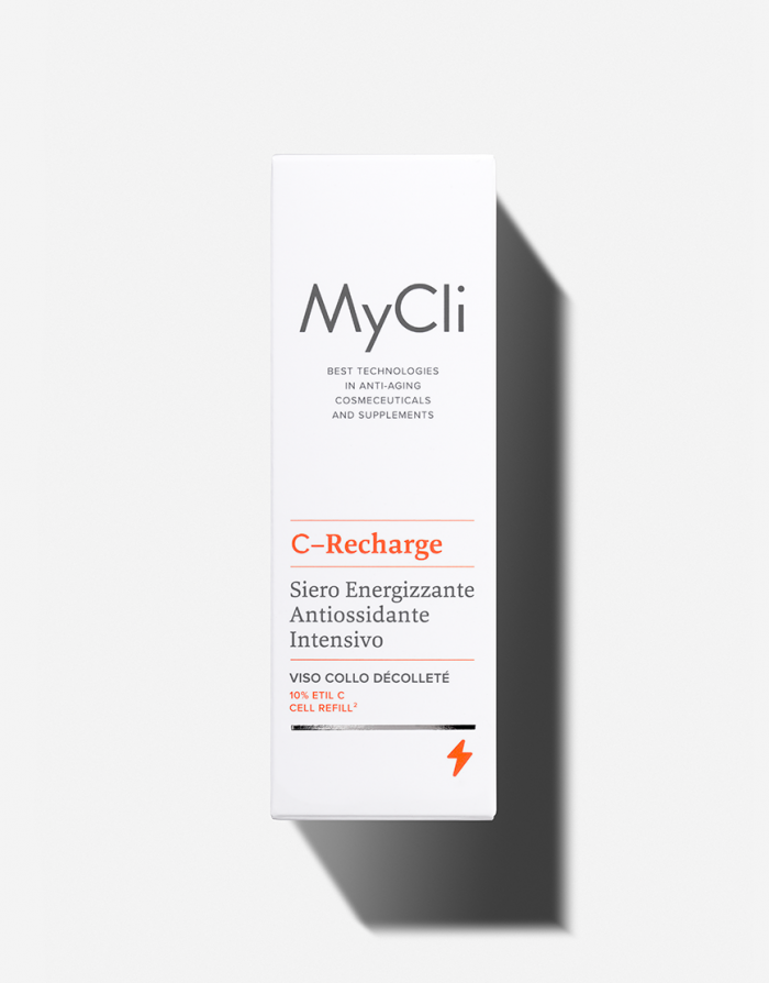 MyCli C–Recharge potenzia l’efficacia antiossidante della vitamina C con un complesso esclusivo di carnitina e ribosio – Cell Refill² – che stimola il mitocondrio a ricaricare le cellule di energia e contrasta i danni indotti dai radicali liberi. Una doppia azione che rende la pelle più ossigenata, vitale e resiliente. L’alta concentrazione di vitamina C promuove un’azione intensiva e la texture ultra sottile in siero permette un’efficace penetrazione degli attivi per risultati rapidi e duraturi.
