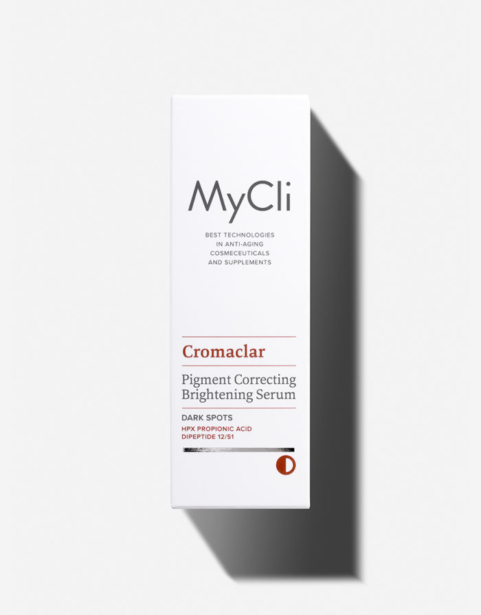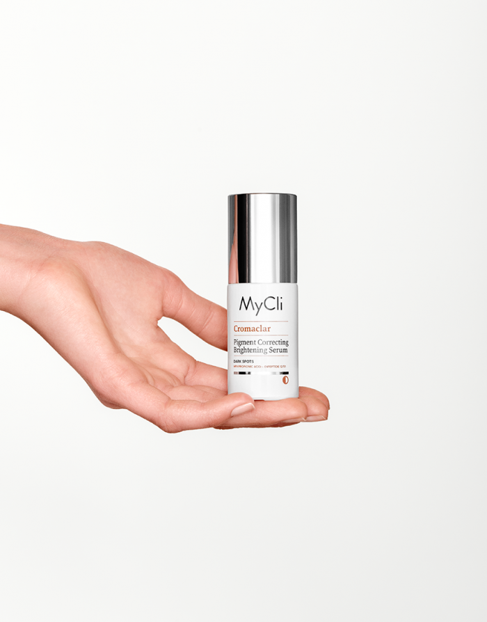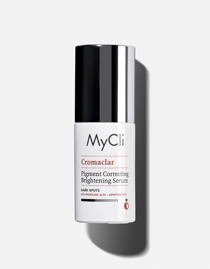 MyCli Cromaclar Siero è un trattamento ultra correttivo delle zone iperpigmentate che presentano macchie brune. La sua formula svolge un’azione schiarente enzimatica sulle macchie e interviene nella produzione endogena di melanina bloccandone il rilascio da parte delle cellule deputate alla produzione – i melanociti – e prevenendo la comparsa di macchie scure. Inoltre, uniforma il colorito e contrasta il photo-aging per una pelle chiara e luminosa. Tecnologia micromolecolare integrata a base di acido idrossifenossi propionico, dipeptide 12, dipeptide 51, niacinamide e vitamina C.