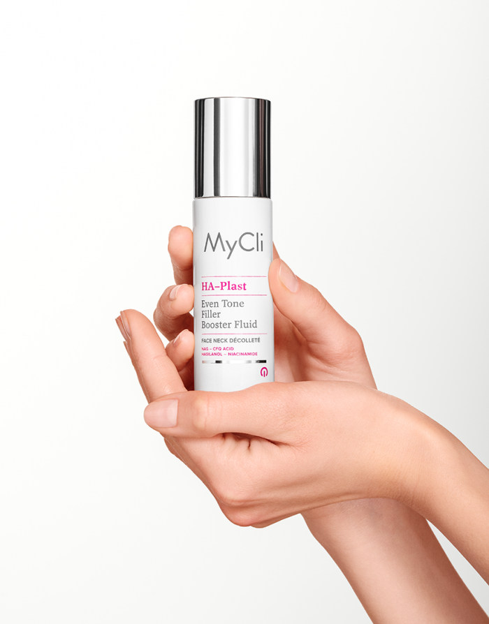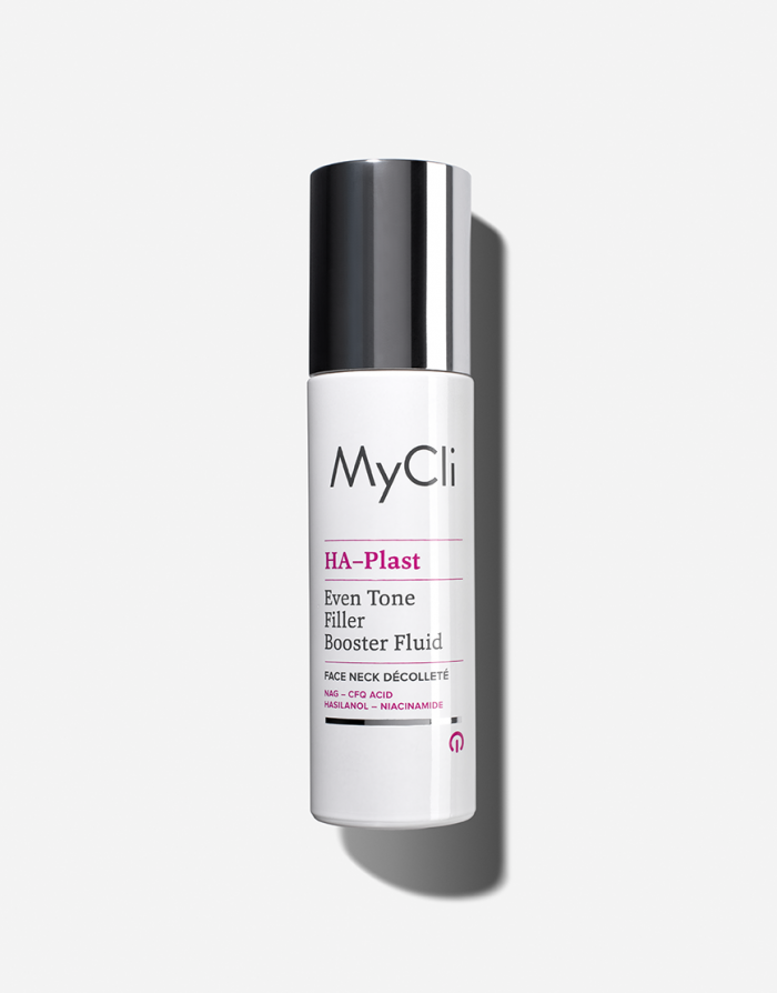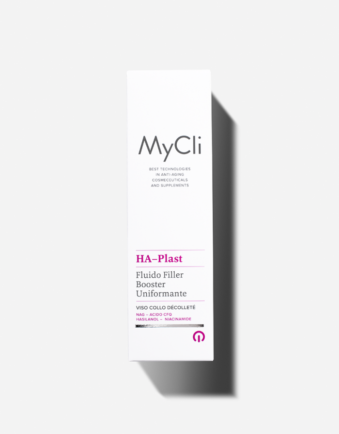 MyCli HA–Plast Fluido Filler Booster Uniformante è un’emulsione polimerica leggera ad effetto dermo riempitivo. La sua formula rilancia la produzione di acido ialuronico endogeno, dando plasticità alla cute e contrastando la perdita di volume. Inoltre, potenzia l’attività dei fibroblasti e aumenta l’idratazione epidermica per una pelle più turgida, riempita e visibilmente idratata. Tecnologia micromolecolare integrata a base di: NAG, acido CFQ, silanolo specializzato e niacinamide.