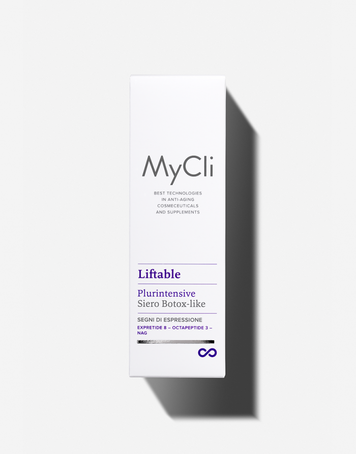 MyCli Liftable Plurintensive Siero è un siero ad effetto botox-like specifico per tutte le zone del viso dove, anche in giovane età, si formano rughe di espressione. La sua formula le attenua e distende, supporta il bilancio idrico superficiale della cute e contrasta la pigmentazione irregolare, per una pelle dall’aspetto più disteso, luminoso e tonico. Tecnologia micromolecolare integrata a base di: NAG, Octapeptide 3, Expretide 8 e Esapeptide 1.